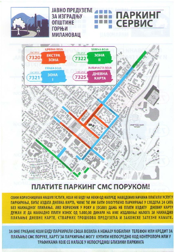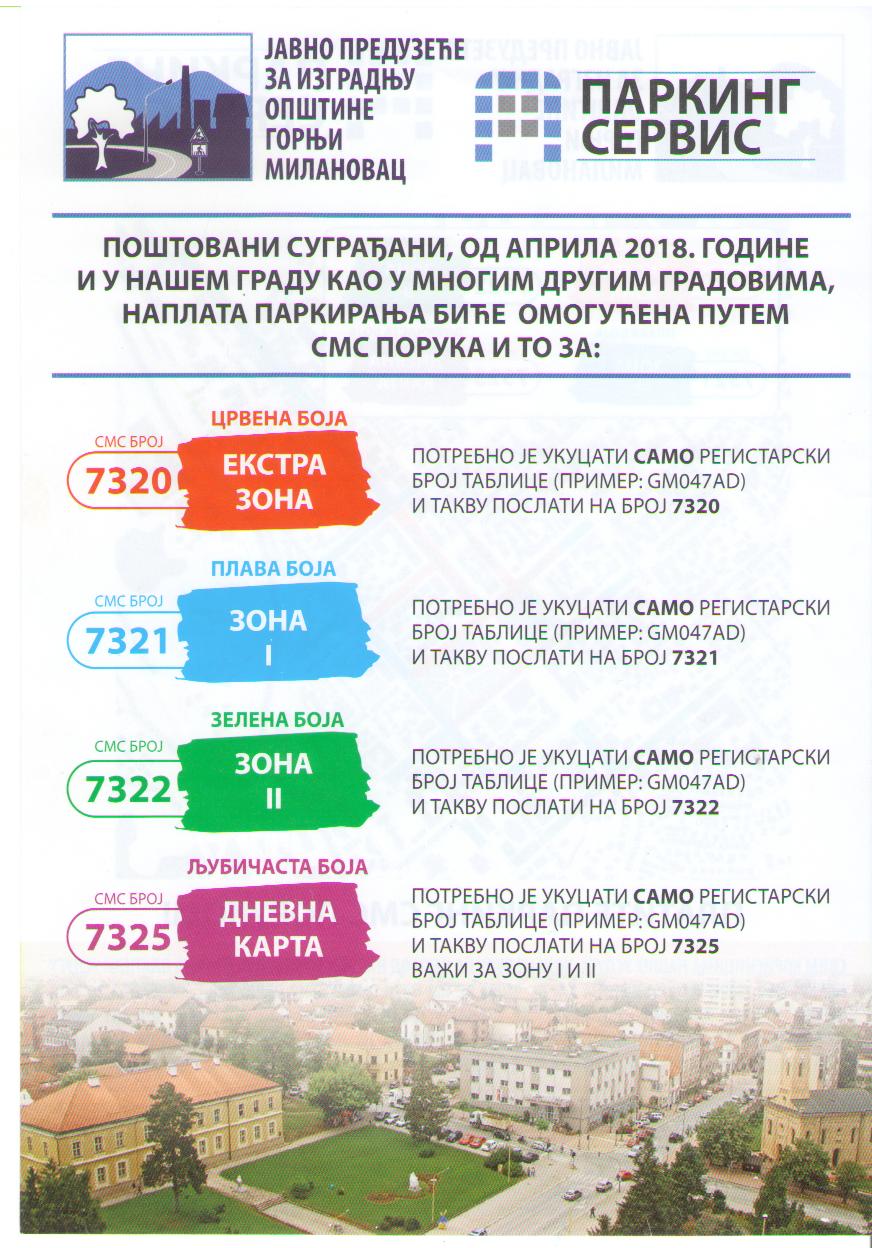 Od aprila 2018. Godine u Gornjem Milanovcu, naplata parking mesta je omogućena putem SMS poruka I to za: